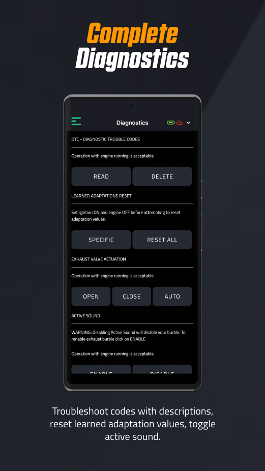 - Live Dash - realtime vehicle parameter monitoring via in-app gauges