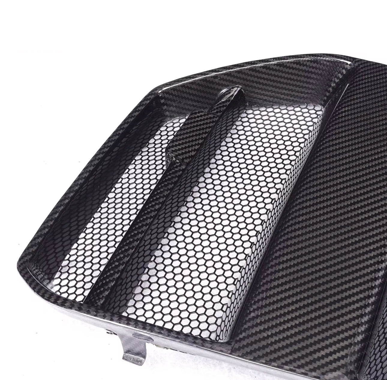 Dry Carbon Fiber V Style Grille With Mesh. Designed for premium aesthetics and performance, this is crafted using only high-quality 2x2 twill carbon fiber and engineered to deliver a aggressive and bold appearance.